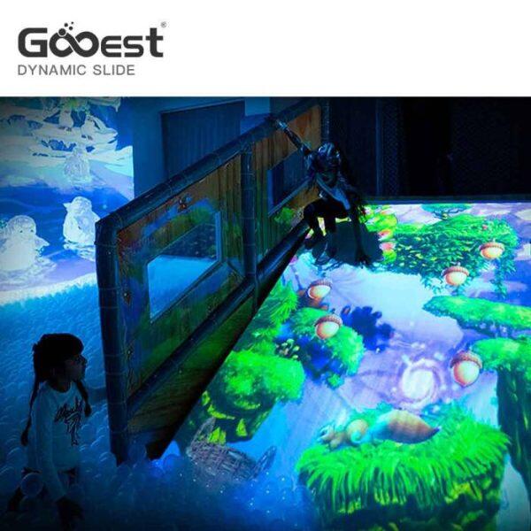 e) La diapositiva interactiva es una diapositiva tradicional combinada con equipos de proyección y programas de computadora, para agregar una experiencia más interactiva. A medida que los niños se deslizan por el tobogán, interactuarán con las formas de arriba o caerán al agua u hojas esparcidas.