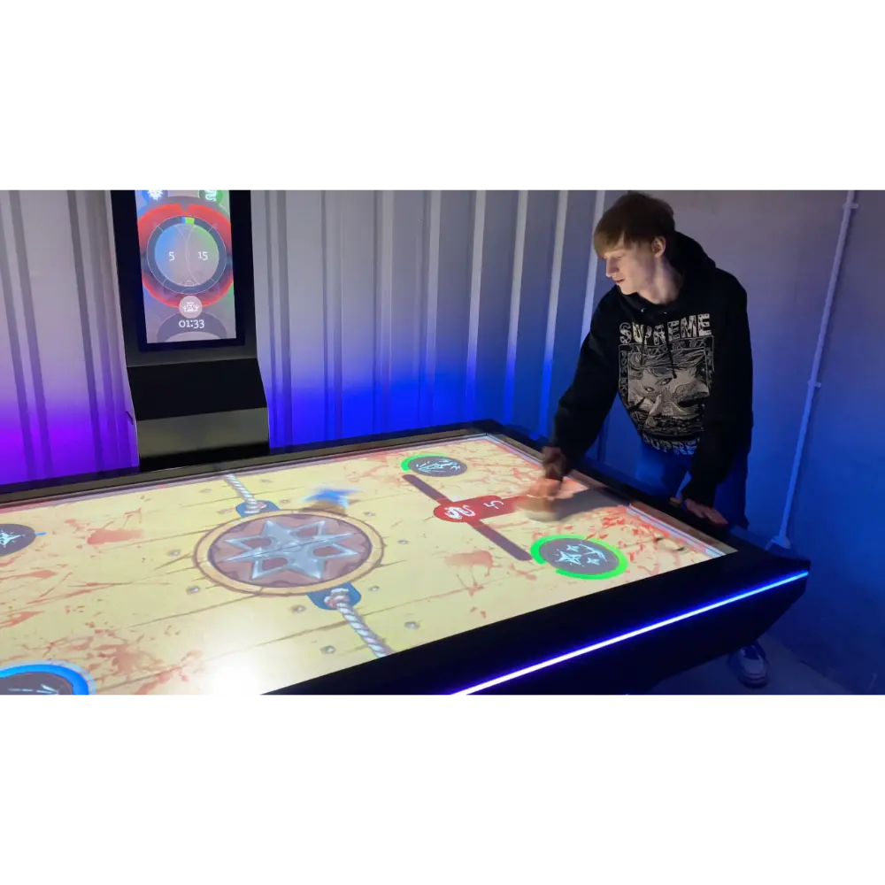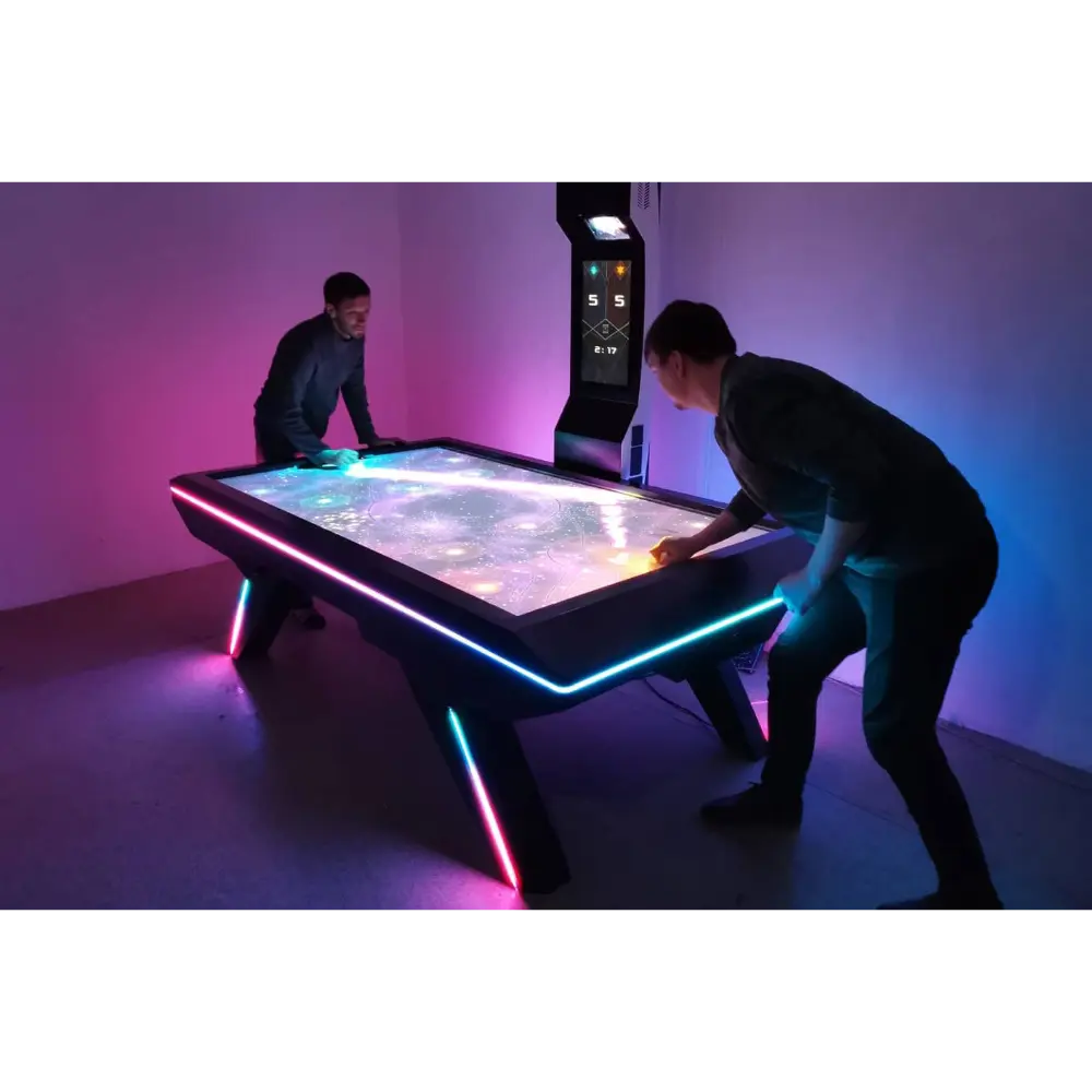 El Air Hockey de Realidad Aumentada es una innovadora solución de entretenimiento que combina la mecánica tradicional del hockey de aire con proyección digital interactiva. Los jugadores utilizan paletas reales y un disco físico, pero la superficie de juego se transforma gracias a imágenes de realidad aumentada de alta calidad que responden dinámicamente a la partida. El sistema actualmente admite cinco modos de juego diferentes, cada uno con efectos visuales y desafíos únicos que requieren que los jugadores adapten sus estrategias a las superposiciones digitales. La mesa está diseñada para ser duradera y visualmente atractiva. Cuenta con una estructura de acero con acabado mate, lo que garantiza su resistencia a largo plazo incluso en entornos de alto tráfico. Las mejoras estéticas incluyen iluminación LED empotrada alrededor de los bordes y las patas de la mesa, creando un ambiente futurista que complementa la experiencia de realidad aumentada. Para mayor flexibilidad operativa, la unidad admite pagos sin contacto, monedas o configuraciones de juego gratuito, lo que la hace ideal para salones recreativos, exposiciones y centros educativos. Los operadores se benefician de un panel de visualización integrado que proporciona acceso a las analíticas del juego, lo que les permite realizar un seguimiento de los patrones de uso y optimizar la participación. Esta combinación de jugabilidad táctil, imágenes inmersivas y hardware robusto convierte a Air Hockey de Realidad Aumentada en una atracción destacada en cualquier espacio de juegos interactivos