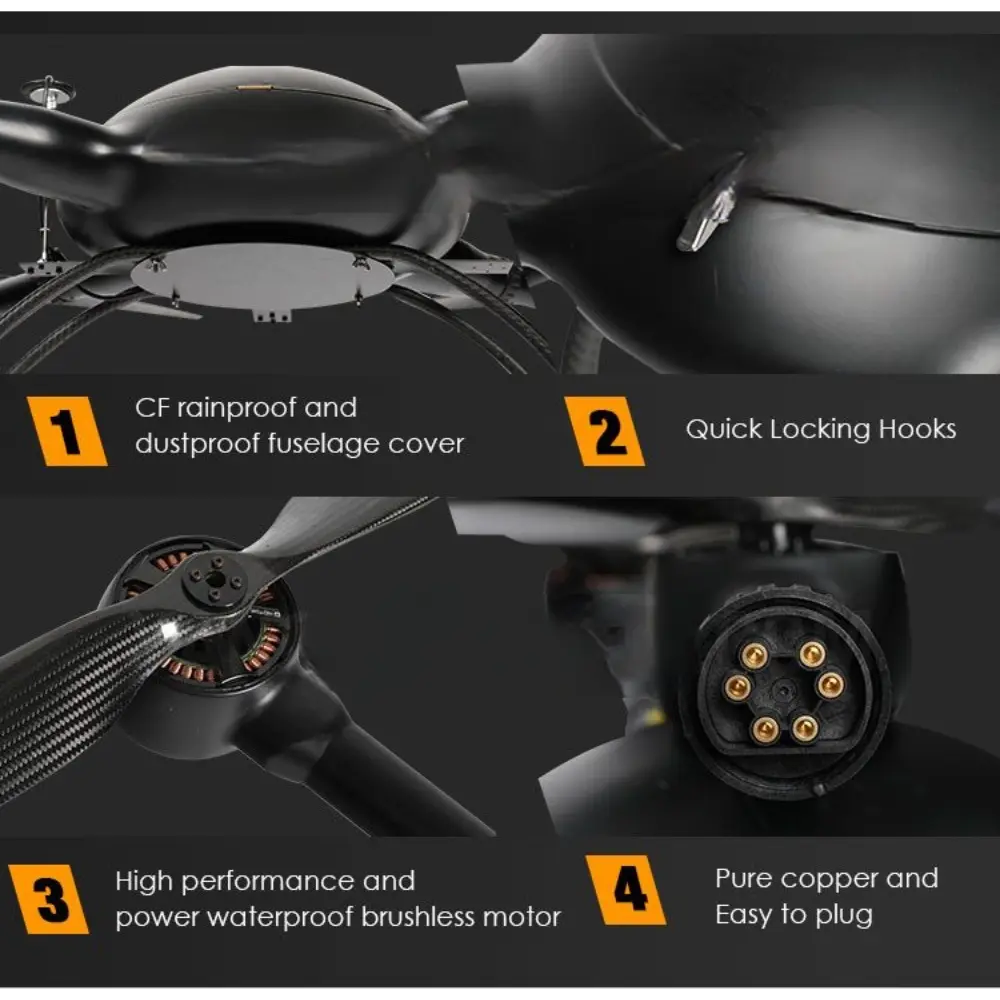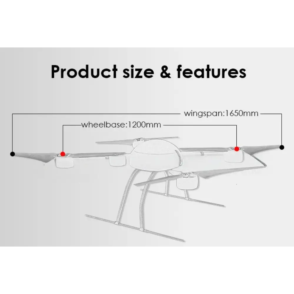 1 x Estructura de fibra de carbono para cuadricóptero YD4-1000S 4 x Motores T-Motor 4 x ESC T-Motor 2 x Hélices Falcon de 29 x 8,7 pulgadas 1 x Controlador de vuelo CUAV V5+ con módulo GPS NEO V2 1 x Controlador de radio de 16 canales YR16S 2 x Baterías de litio Tattu 6S de 25000 mAh y 22,8 V de alto voltaje 1 x Servicio de ensamblaje y prueba 1 x Software de control terrestre LAUNCH