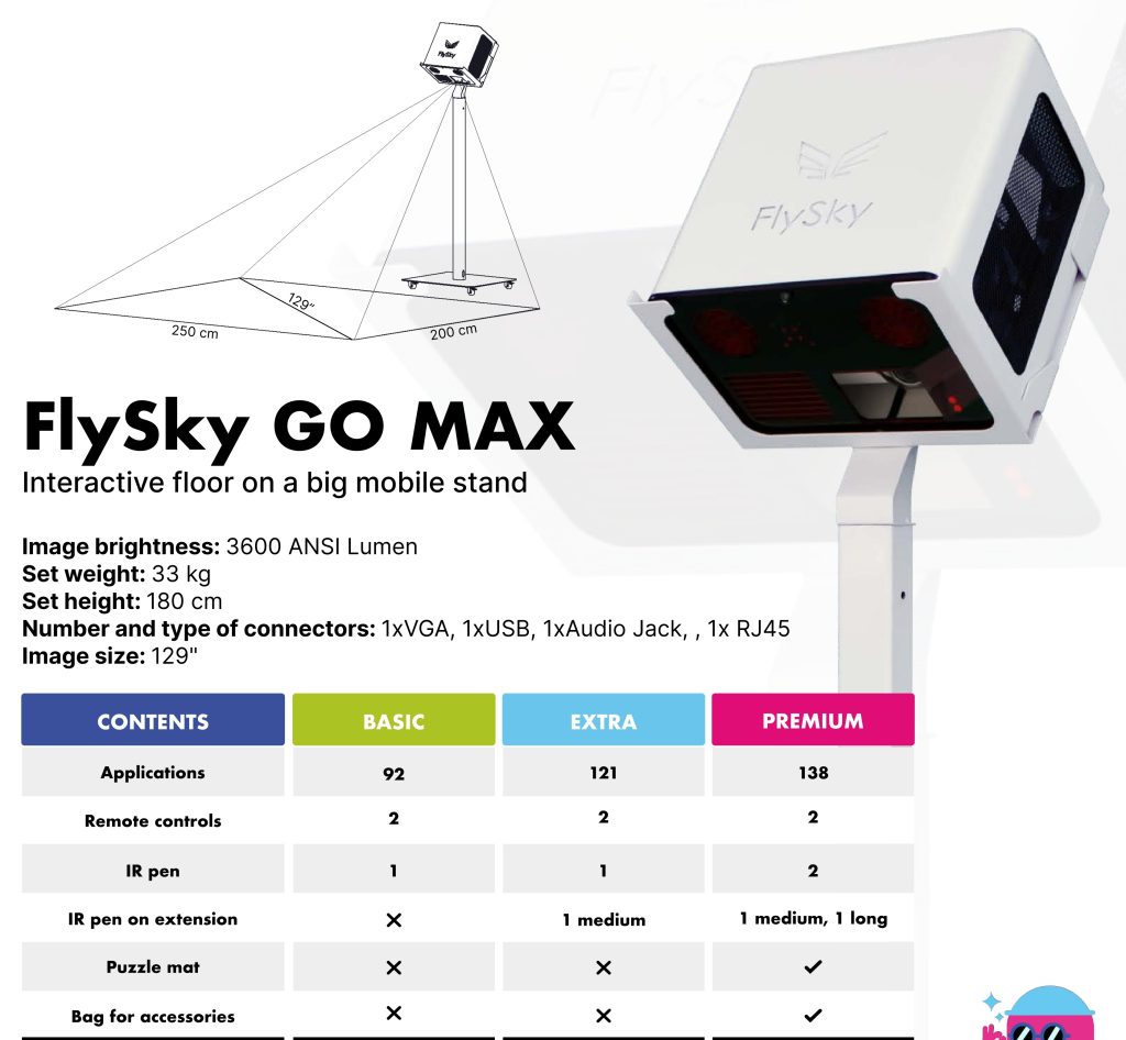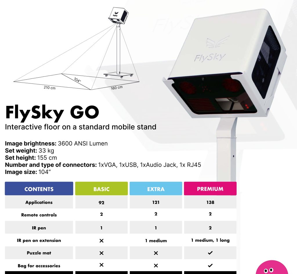 El FlySky Piso Interactivo es una herramienta versátil de educación, formación y terapia. Proporciona una experiencia de aprendizaje atractiva e interactiva a través de su piso interactivo, que puede usarse para varios juegos y aplicaciones educativas. Ofrece una variedad de juegos educativos que se adaptan a diferentes materias y estilos de aprendizaje: Juegos de Matemáticas, Juegos de Lenguaje, Actividades de Ciencia y STEAM, Quizzes y Trivia, Juegos de Actividad Física, Juegos Creativos y Artísticos, Juegos de Resolución de Problemas y Juegos de Lógica. Utiliza todos los sentidos para hacer que el aprendizaje, la formación y la terapia sean inolvidables y divertidos, potenciando la curiosidad cognitiva y el pensamiento lógico. Es una herramienta versátil que puede usarse como piso y mesa interactiva, lo que la hace adaptable a diferentes entornos y necesidades. Apoya a los niños con necesidades educativas especiales al proporcionar un entorno de trabajo apropiado y atractivo, que puede modificarse para lograr objetivos terapéuticos. FlySky elimina los retrasos en la interacción del usuario, se ajusta a los cambios en la iluminación de la sala y reconoce y elimina las sombras, lo que garantiza una calidad de imagen y una experiencia de usuario óptimas. La versión FlySky GO ofrece movilidad, permitiendo trasladarlo fácilmente entre aulas o diferentes ubicaciones sin necesidad de una instalación permanente.