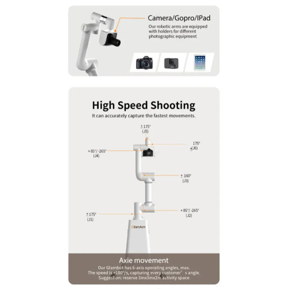 - Ejes: brazo robótico de 6 ejes para trayectorias de movimiento suaves y cinematográficas