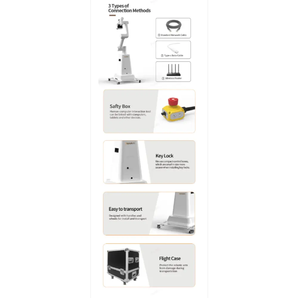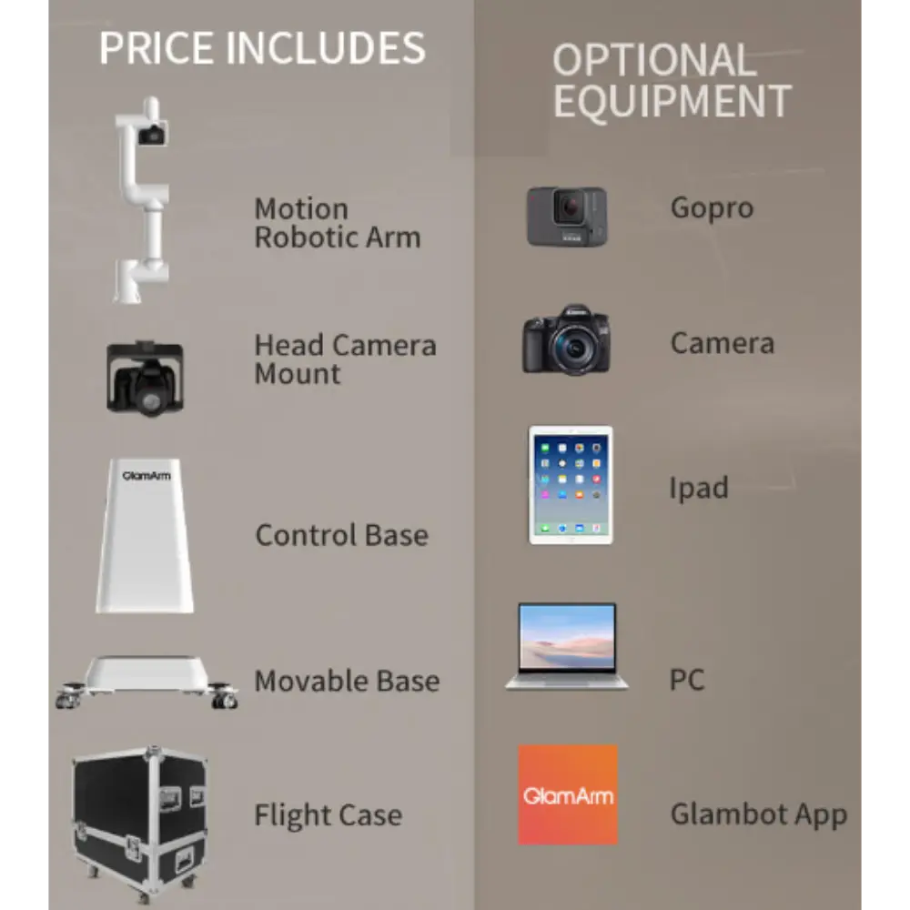 Paquete completo que incluye: 1. Brazo robótico + herramientas de instalación 2. Caja de control para fotomatón Glambot 3. Soporte para alfombra roja Glambot 4. Soporte para cámara GoPro/DSLR + herramientas de instalación 5. Suscripción gratuita de 6 meses a la app PhoPrint 6. Cable Ethernet de 4 m 7. Soporte para iPad 8. Manual del usuario