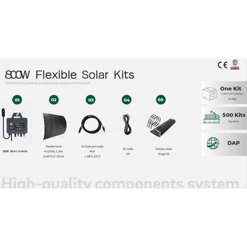 El Kit Solar Flexible para Balcón – Plug & Play (800 Vatios) es una solución inteligente y eficiente para la energía solar residencial, ideal especialmente para balcones o instalaciones en espacios reducidos. Estos kits incluyen paneles fotovoltaicos flexibles, ligeros, fáciles de montar y adaptables a superficies curvas o irregulares, lo que los hace perfectos para entornos urbanos o tejados poco convencionales. Cada kit incluye módulos solares de alta eficiencia, un microinversor y todos los accesorios de montaje necesarios. El sistema está diseñado para una instalación plug-and-play, lo que permite a los usuarios configurarlo rápidamente sin ayuda profesional. Además, los costes de instalación y mantenimiento son mínimos, ya que es plug-and-play y no requiere configuración profesional. Además, permite monitorizar la energía en tiempo real, lo que permite realizar un seguimiento de la generación y el consumo de energía a través de una aplicación intuitiva. Certificado por organismos internacionales como TÜV y SGS, el Kit Solar Flexible de 800 W cumple rigurosos estándares de seguridad y rendimiento. Ya sea que busque reducir sus facturas de electricidad o dar un paso hacia la independencia energética, este sistema de 800 W ofrece una opción confiable y ecológica.