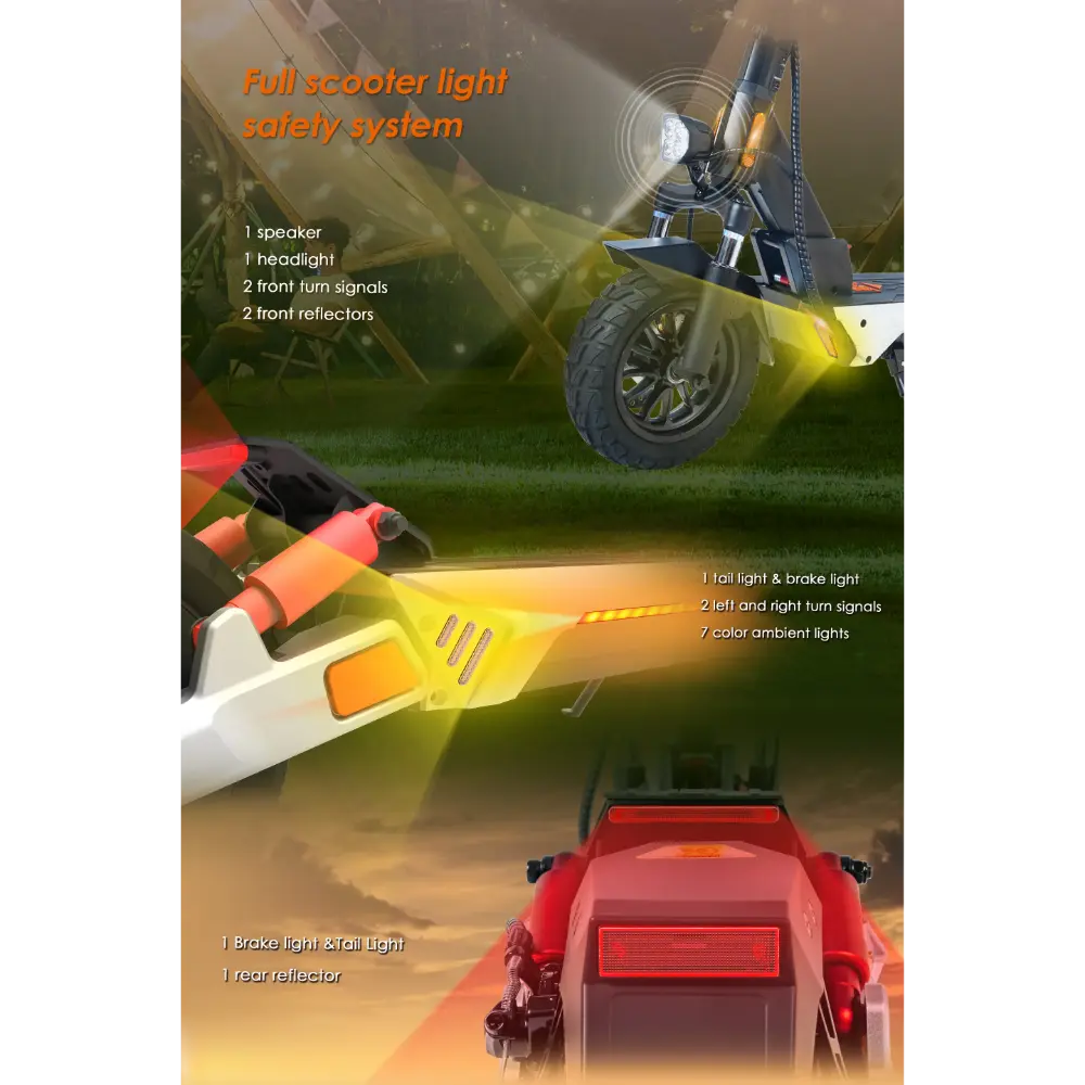 - Sistema de iluminación: faros de haz ancho, luz de freno, luces de giro e iluminación ambiental de 7 colores