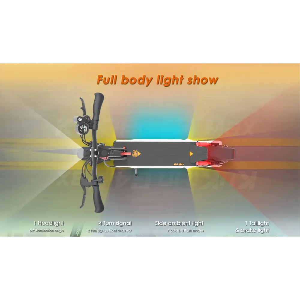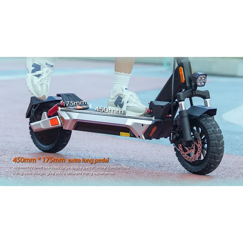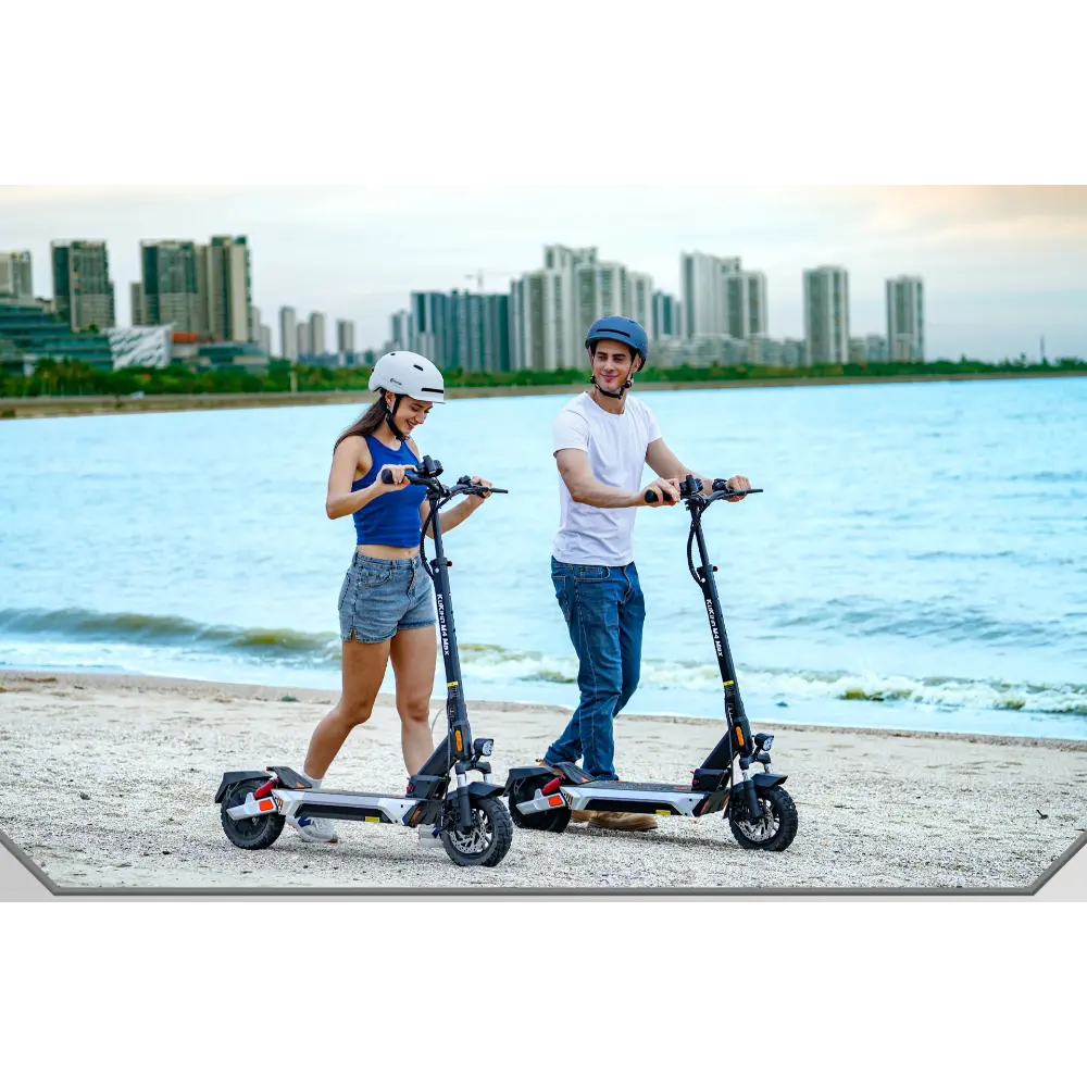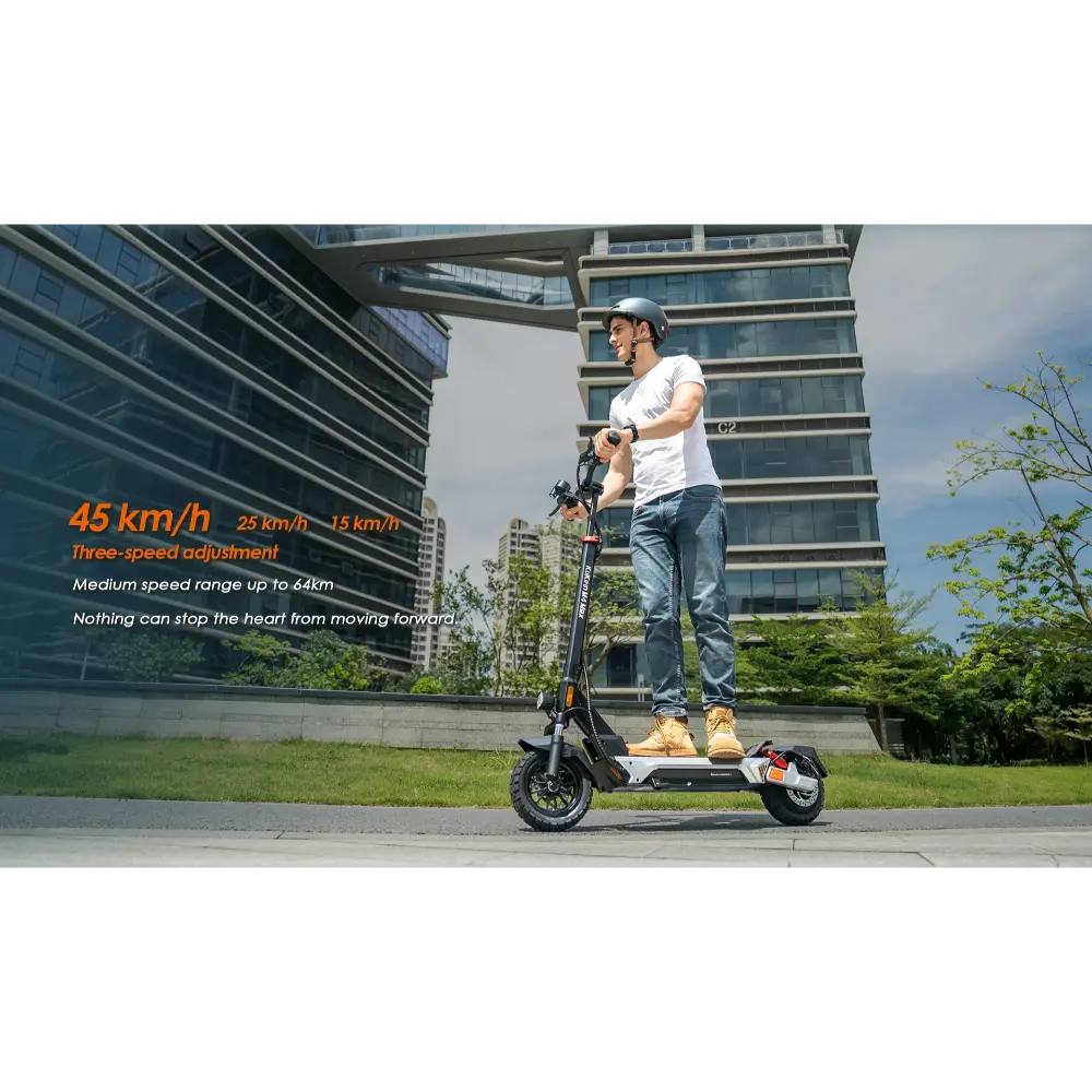 El KuKirin M4 Max Patinete Eléctrico es un vehículo de alto rendimiento diseñado tanto para quienes se desplazan por la ciudad como para los aventureros de fin de semana. Impulsado por un motor sin escobillas de 800 W con una potencia máxima de 1000 W, alcanza velocidades de hasta 45 km/h, lo que lo hace ideal para recorrer las calles de la ciudad o afrontar pendientes moderadas de hasta 20°. Su batería de litio de 48 V y 18,2 Ah ofrece una impresionante autonomía de hasta 64 km por carga, lo que garantiza viajes de larga distancia sin necesidad de recargas frecuentes. El patinete cuenta con neumáticos sin cámara de 10 pulgadas que ofrecen un excelente agarre y absorción de impactos, además de un sistema de suspensión de cuatro brazos y frenos de disco dobles para mayor seguridad y comodidad. Según sus necesidades, los usuarios pueden elegir entre tres modos de velocidad: 15 km/h, 25 km/h y 45 km/h. Un mecanismo de plegado rápido con bloqueo de seguridad facilita su transporte, mientras que la espaciosa plataforma de pedales y el intuitivo tablero de instrumentos ofrecen una experiencia fluida y fácil de usar. Con iluminación ambiental, direccionales y un faro de haz ancho, la KuKirin M4 Max garantiza visibilidad y estilo, de día y de noche.