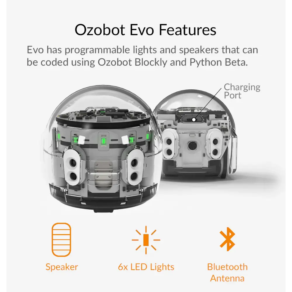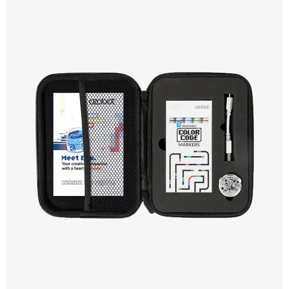 • Contenido del kit: 1 robot Evo, 1 cable de carga micro-USB, 5 marcadores Color Code de doble punta, 1 funda protectora con cremallera, acceso a lecciones y actividades en línea.