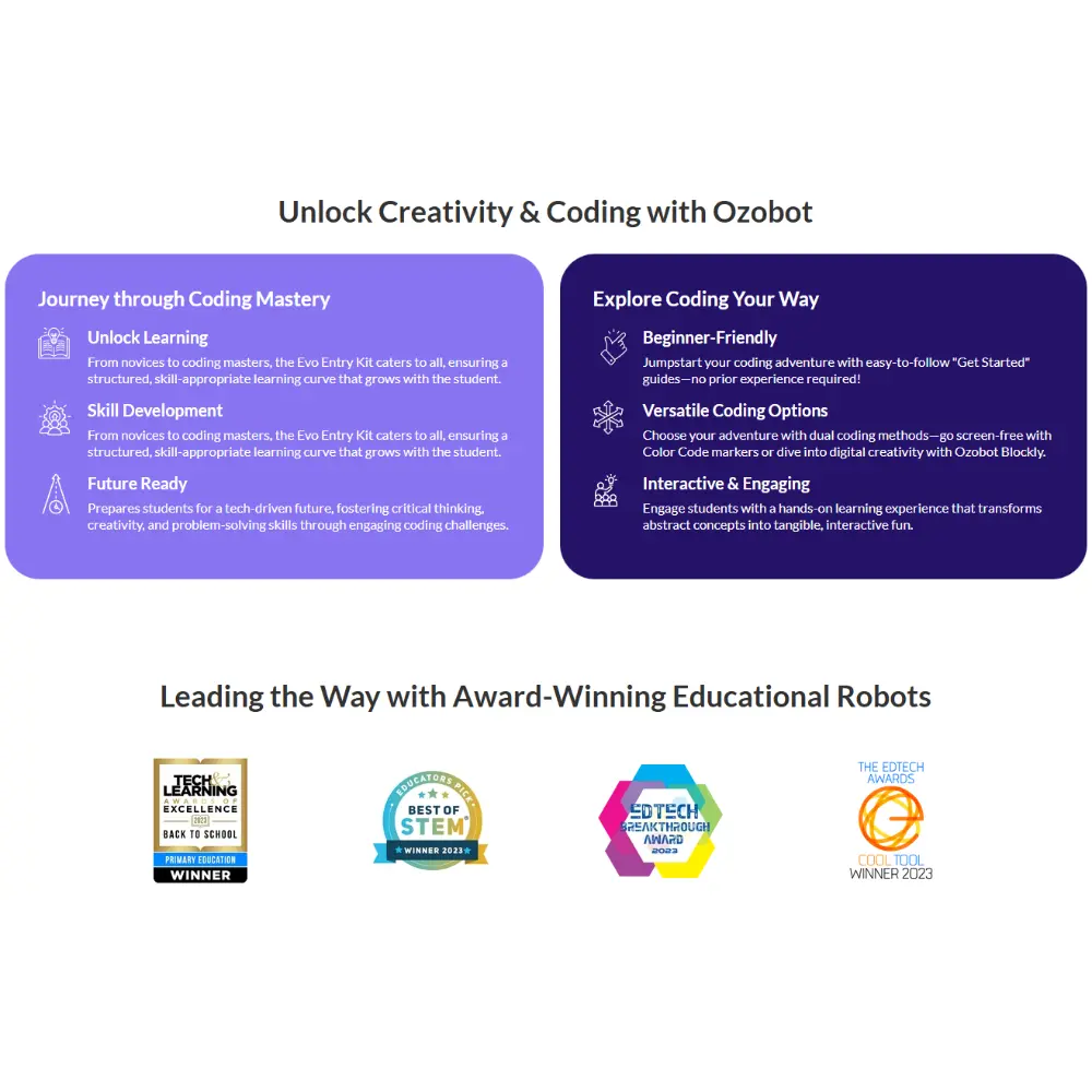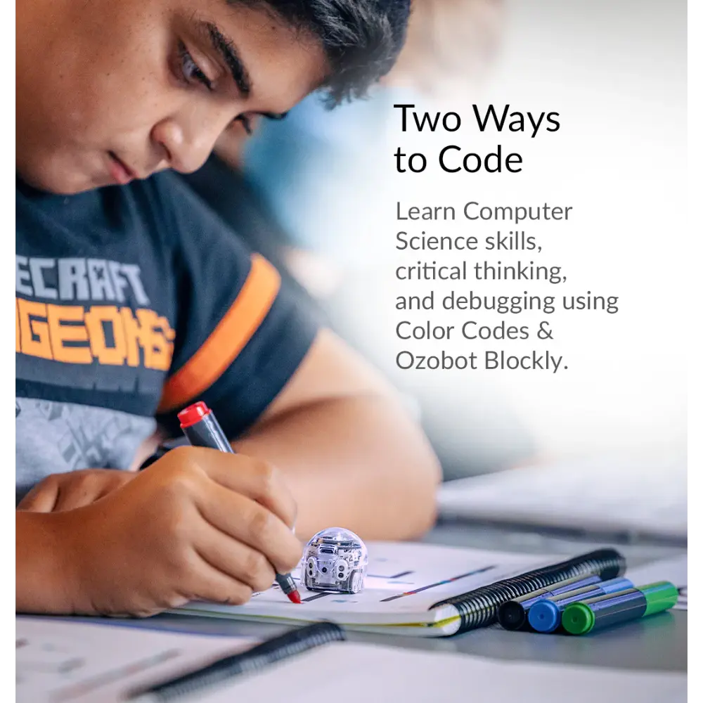 • Opciones de programación: OzoBlockly (codificación visual de arrastrar y soltar con 5 niveles de dificultad), codificación sin pantalla con marcadores de código de color.