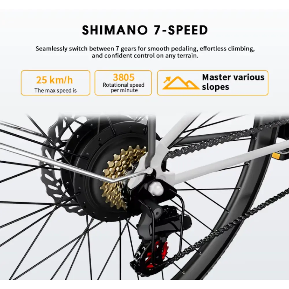 La PIXAR Cruiser Bicicleta Eléctrica Urbana es una elegante bicicleta diseñada para la ciudad, pensada para ofrecer comodidad, autonomía y practicidad diaria. Pensada para quienes se desplazan por la ciudad, combina una estética moderna con una ingeniería robusta. Incorpora un motor BAFANG de 250 W en la rueda trasera que proporciona una aceleración suave hasta 25 km/h, ideal para calles urbanas y pendientes moderadas de hasta 35°. La batería Samsung de 36 V y 12,8 Ah ofrece una impresionante autonomía de hasta 120 km con una sola carga, garantizando largos recorridos sin recargas frecuentes. Su cuadro de aleación de fácil acceso facilita subir y bajar de la bicicleta, especialmente para ciclistas con vestimenta informal o formal. La bicicleta está equipada con cambios Shimano de 7 velocidades y frenos de disco hidráulicos para un control preciso y una frenada segura. Una pantalla a color en tiempo real mejora el seguimiento del recorrido, mientras que accesorios como guardabarros, portaequipajes trasero, acelerador y faro delantero añaden utilidad y valor. Con un peso de 29 kg, el PIXAR Cruiser cuenta con las certificaciones CE y RoHS, combinando rendimiento, seguridad y estilo para la movilidad urbana moderna.