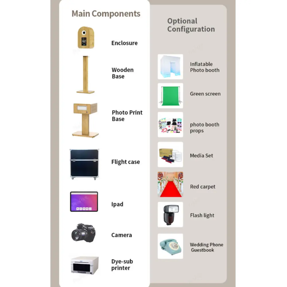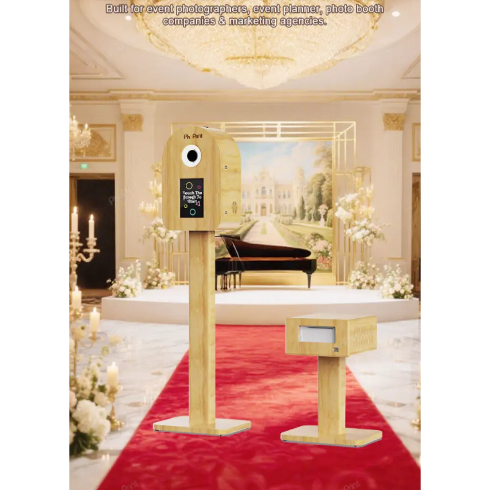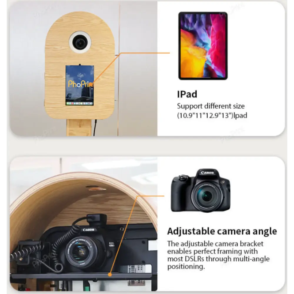 El Fotomatón Retro DSLR para iPad combina el estilo vintage con características modernas, ofreciendo una configuración de doble pantalla y compatibilidad con cámaras DSLR para fotografía de eventos de alta calidad. Es una estación fotográfica elegante y versátil diseñada para eventos profesionales. Su característica principal es la configuración de doble pantalla, que combina una interfaz de iPad de 10,9 a 13 pulgadas con una pantalla táctil de 18,5 pulgadas para una interacción intuitiva y un funcionamiento fluido. El fotomatón es compatible con cámaras DSLR, específicamente la Canon 2000D, e incluye un sistema modular de desmontaje rápido para facilitar su transporte e instalación. Fabricado con materiales de primera calidad, cuenta con una sólida estructura de madera y un soporte de cámara ajustable de aluminio, que combina durabilidad y elegancia. Con un peso de tan solo 35 kg, es altamente portátil e incorpora ventilación segura y refrigeración bloqueable para proteger los componentes internos. El sistema Pro Flash integrado produce imágenes nítidas incluso con poca luz, y su compatibilidad con impresoras universales funciona con las principales marcas. Perfecto para bodas, fiestas y eventos corporativos, este fotomatón ofrece impresiones instantáneas y una experiencia de usuario memorable.