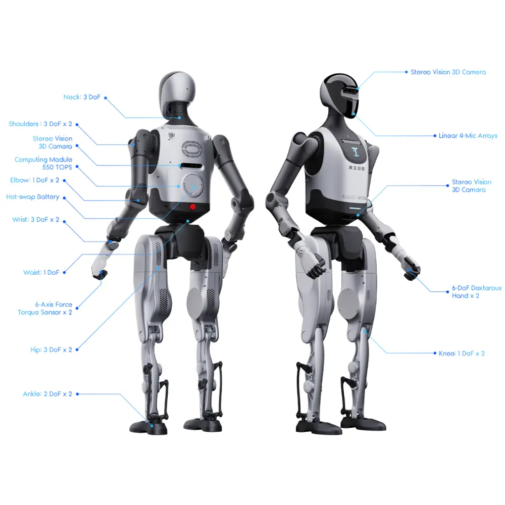 - Grado de libertad total: 42 grados de libertad en la pierna: 7 grados de libertad (hombro 3, codo 1, muñeca 3) x 2, grado de libertad en el brazo: 6 grados de libertad (cadera 3, rodilla 1, tobillo 2) x 2, grado de libertad en la cabeza/cuello: 3 grados de libertad (módulo de cabeza estándar), grado de libertad en la cintura: 1, grado de libertad en la mano diestra: 6 grados de libertad (mano diestra 2) (estándar).