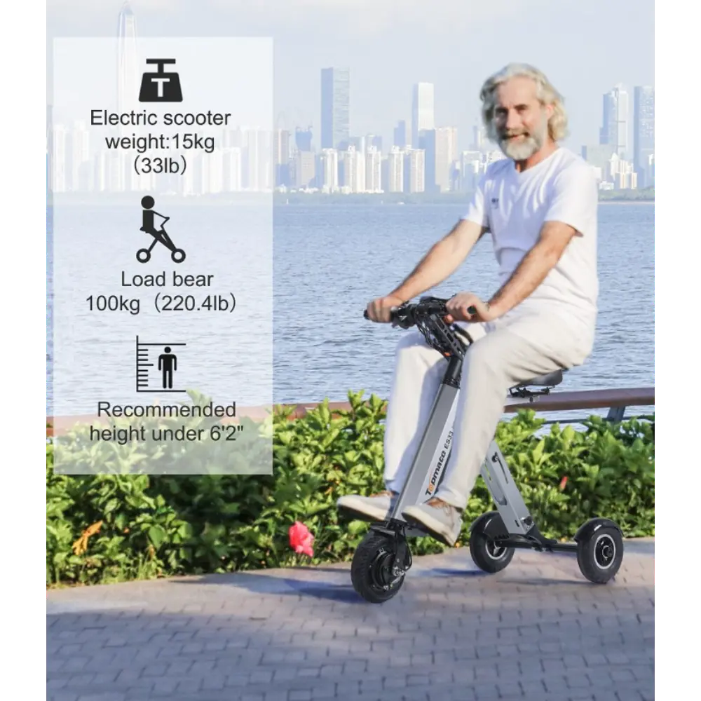 El TopMate ES33 Triciclo Eéctrico Plegable para Adultos con 3 ruedas es un scooter de movilidad compacto y plegable diseñado para adultos que buscan un transporte eléctrico ligero y fácil de transportar. Es un triciclo eléctrico versátil y muy portátil, ideal para desplazamientos diarios, viajes y ocio. Con un peso de tan solo 15 kg, soporta una carga máxima de 100 kg, lo que lo hace adecuado para una amplia gama de usuarios. Su estructura plegable y su tamaño compacto facilitan su almacenamiento en maleteros de coche, armarios o espacios reducidos. Además, su batería de litio extraíble de 36 V y 7,8 Ah permite una carga cómoda y es compatible con viajes en avión. El scooter cuenta con marcha atrás para maniobrar sin esfuerzo en espacios reducidos y un interruptor de llave para mayor seguridad. Su asiento ergonómico proporciona comodidad en trayectos largos, y el diseño de tres ruedas mejora la estabilidad en diversos terrenos. Perfect for urban environments, the ES33 combines practicality with style, providing a smooth ride and easy-to-use controls. Whether navigating city streets or enjoying a park outing, this scooter offers independence and mobility in a sleek, user-friendly package.